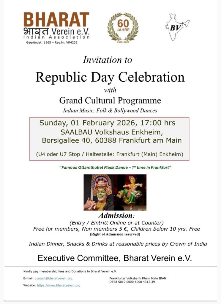 | Indian Republic Day | 01.02.2026 | SAALBAU Volkshaus Enkheim Borsigallee 40, 60388 Frankfurt am Main | Diverse Indian cultural performances. |
